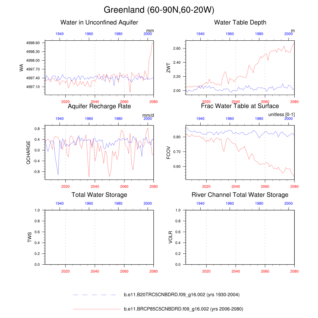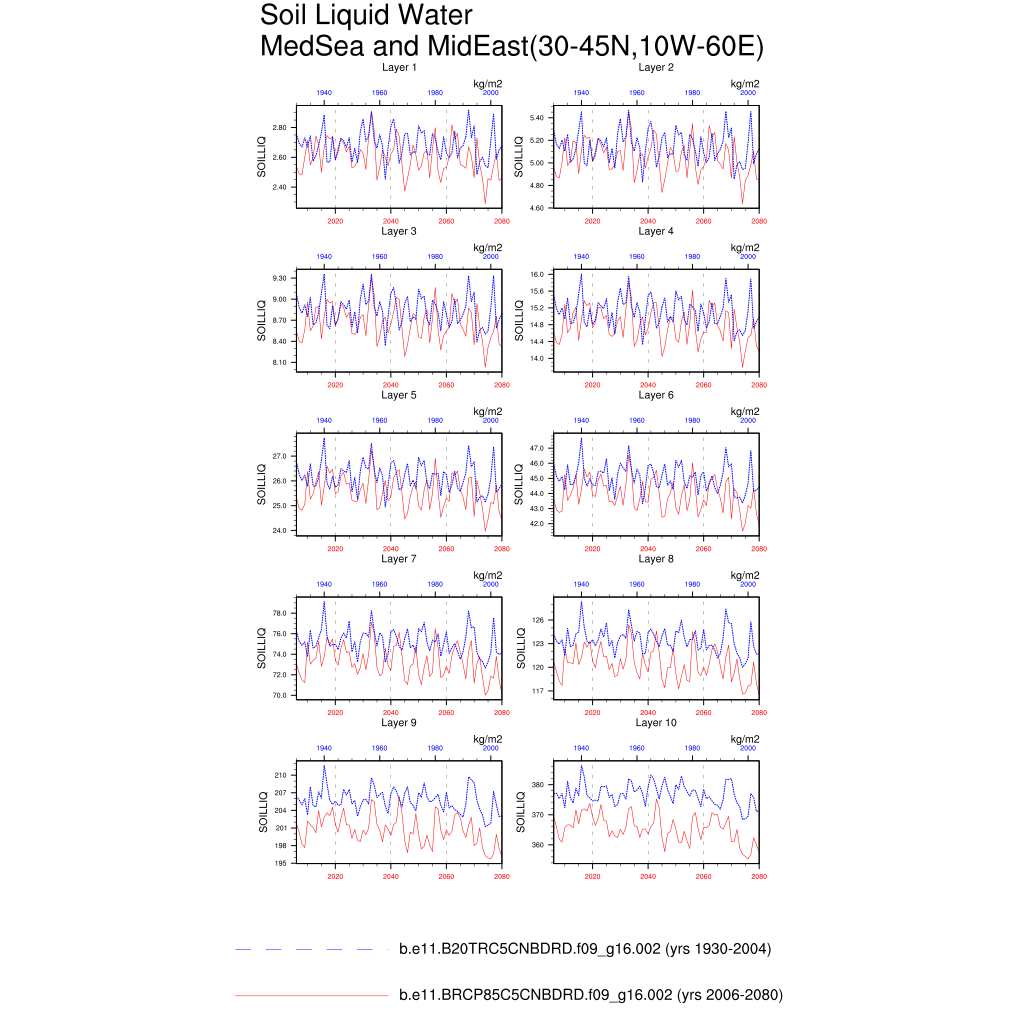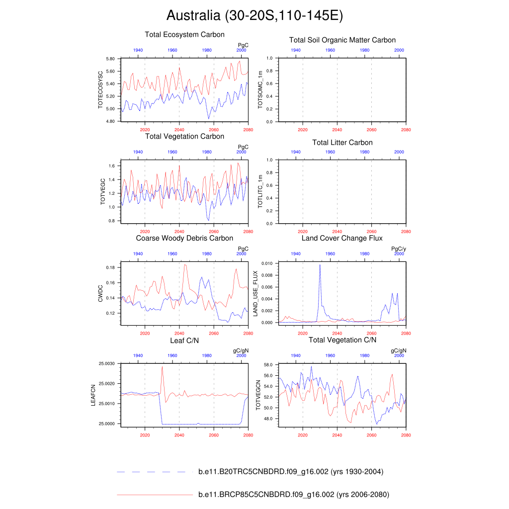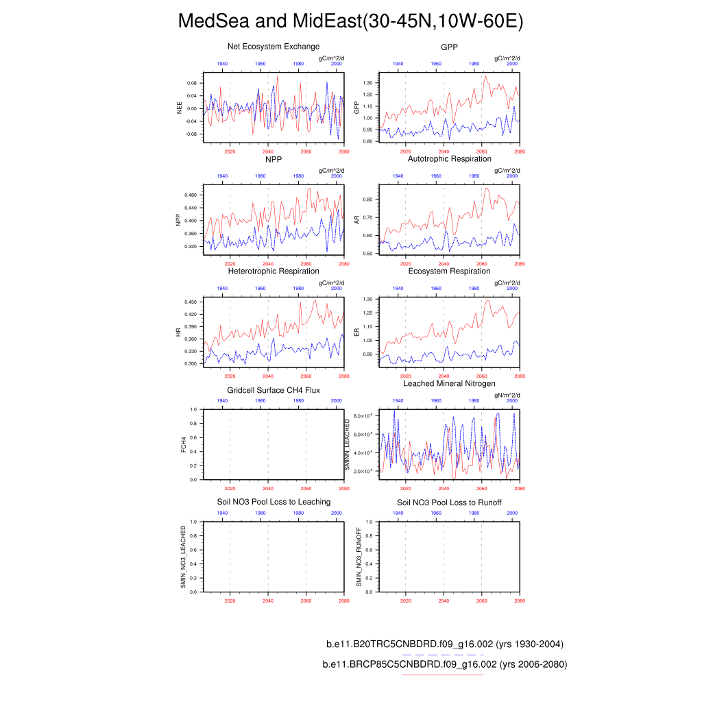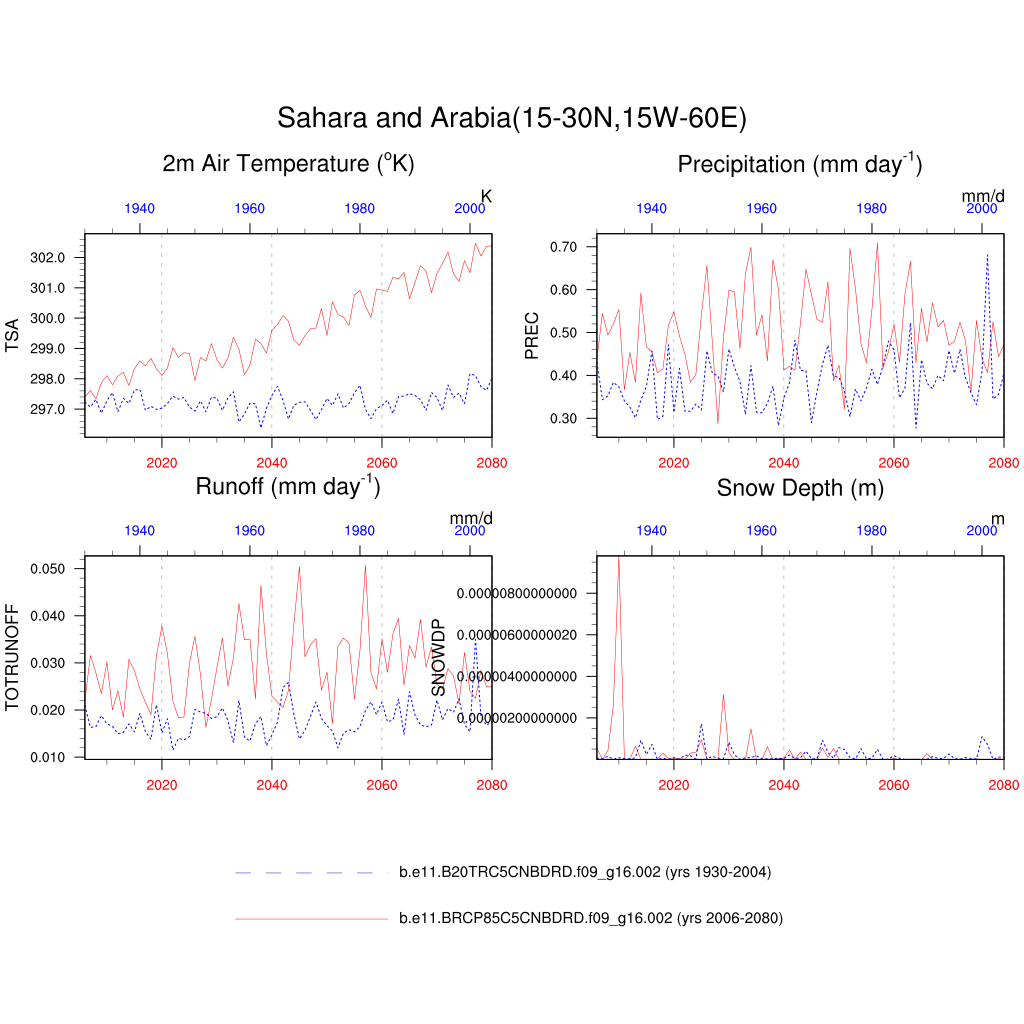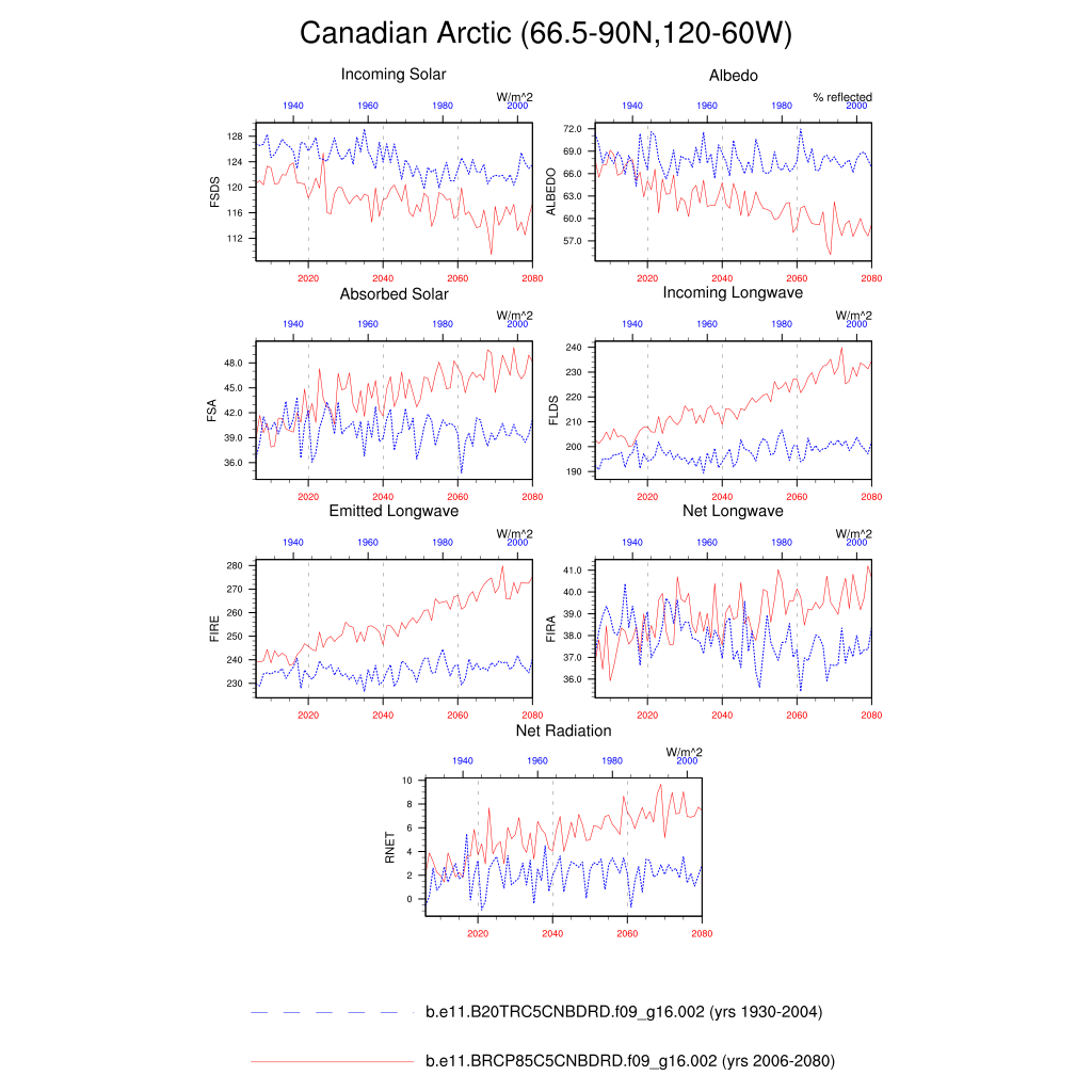 Set 6 Description: Line plots of annual trends in regional soil water/ice and temperature, runoff, snow water/ice, photosynthesis