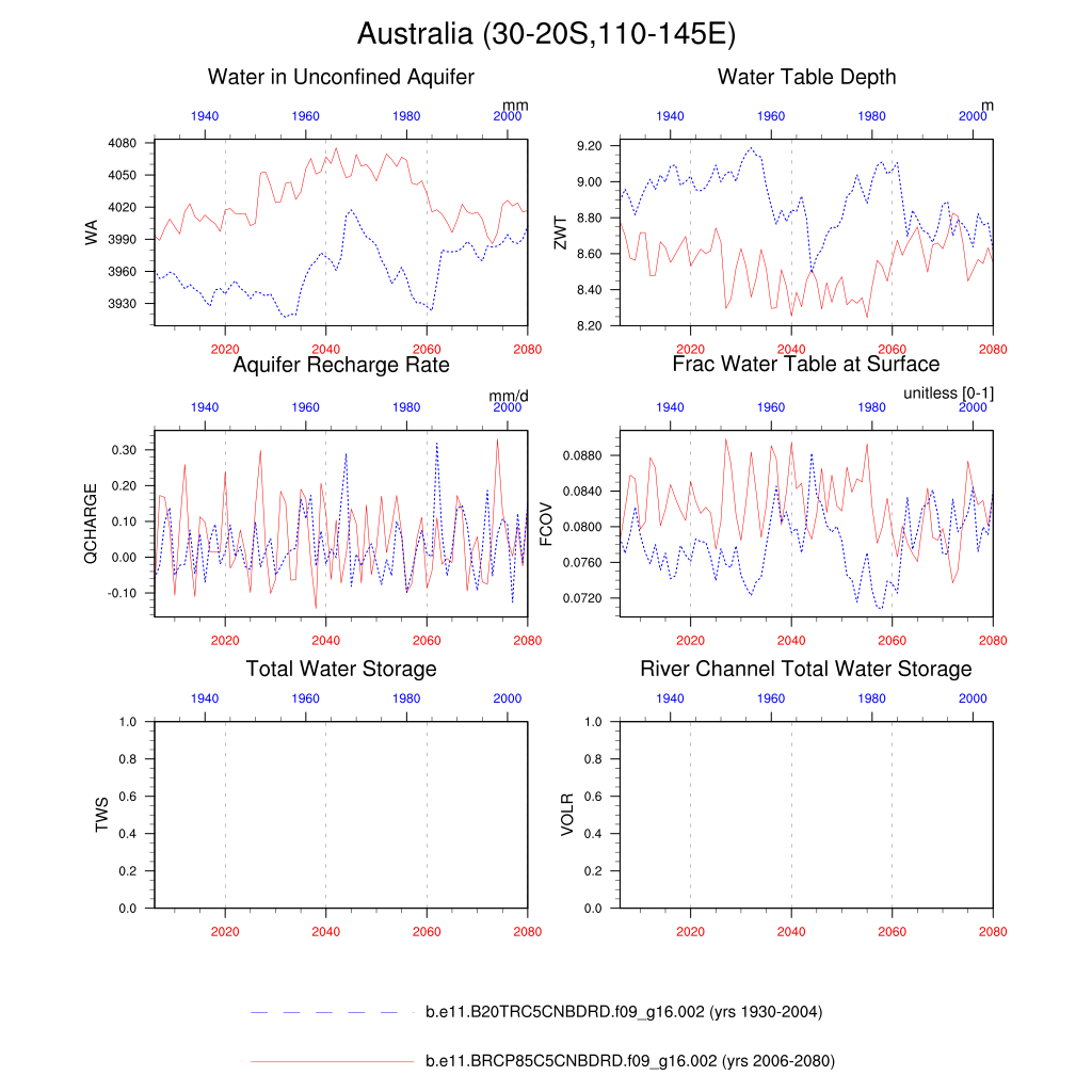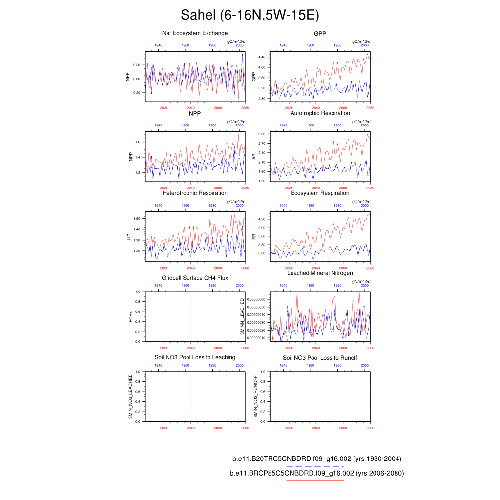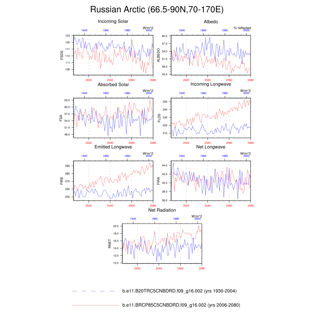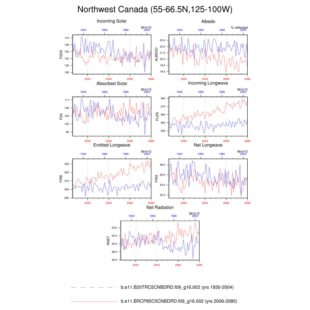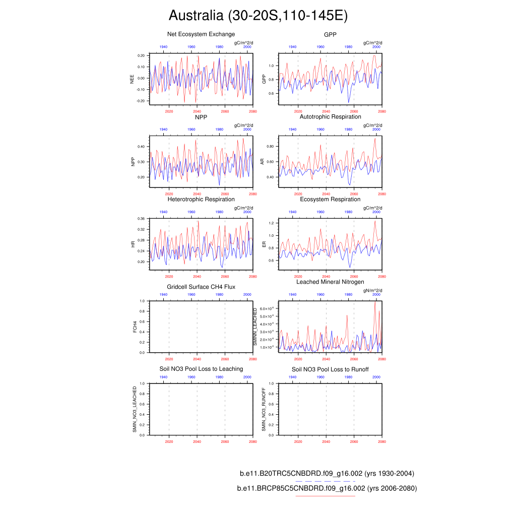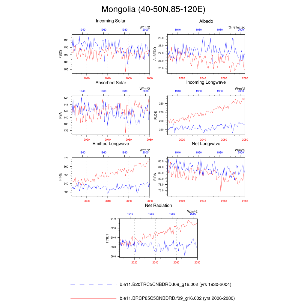 Set 6 Description: Line plots of annual trends in regional soil water/ice and temperature, runoff, snow water/ice, photosynthesis