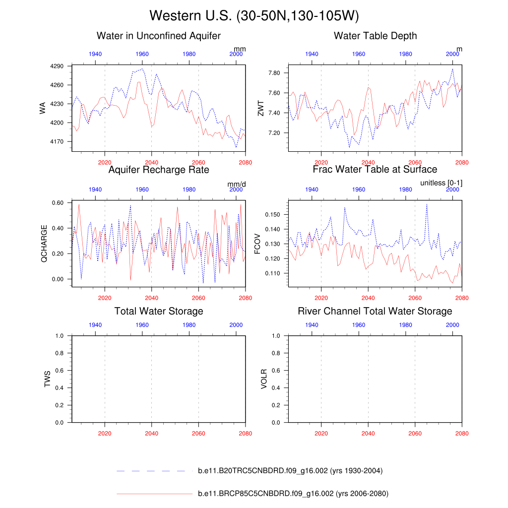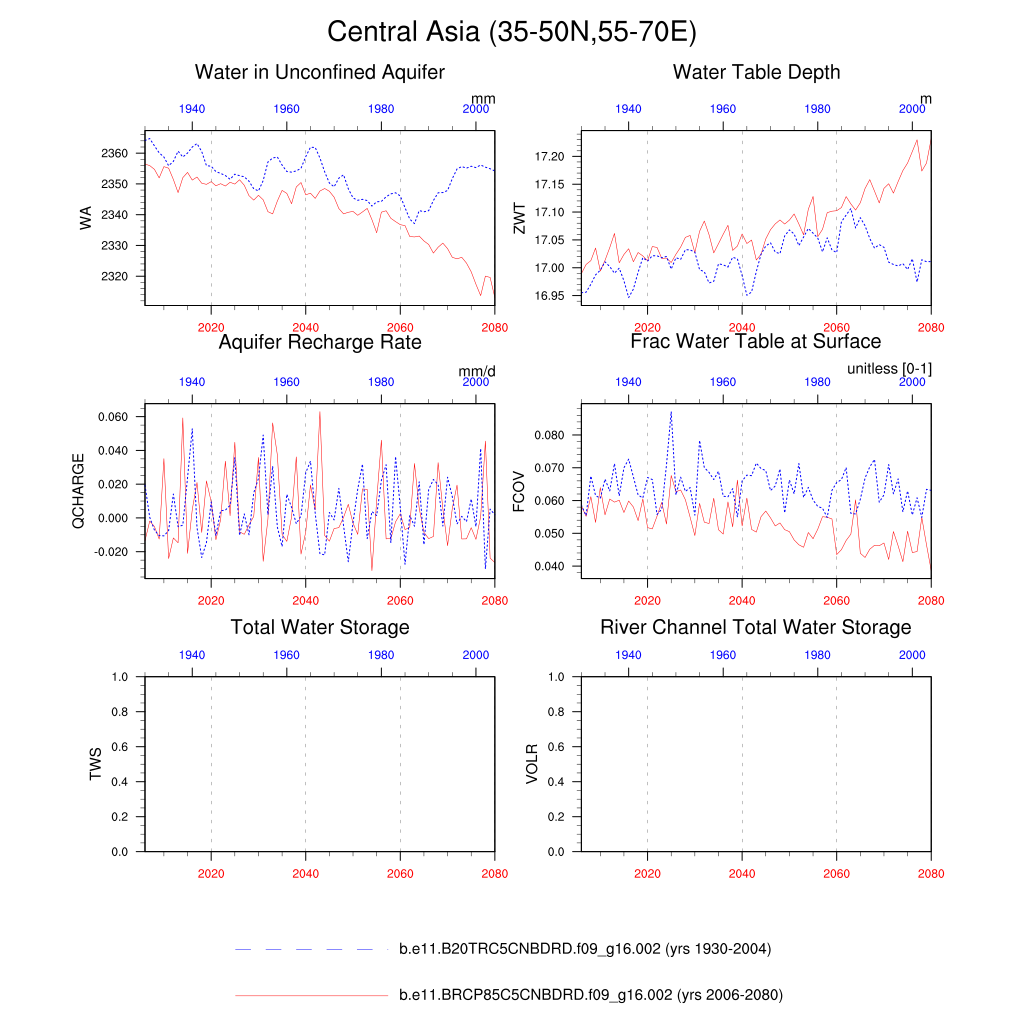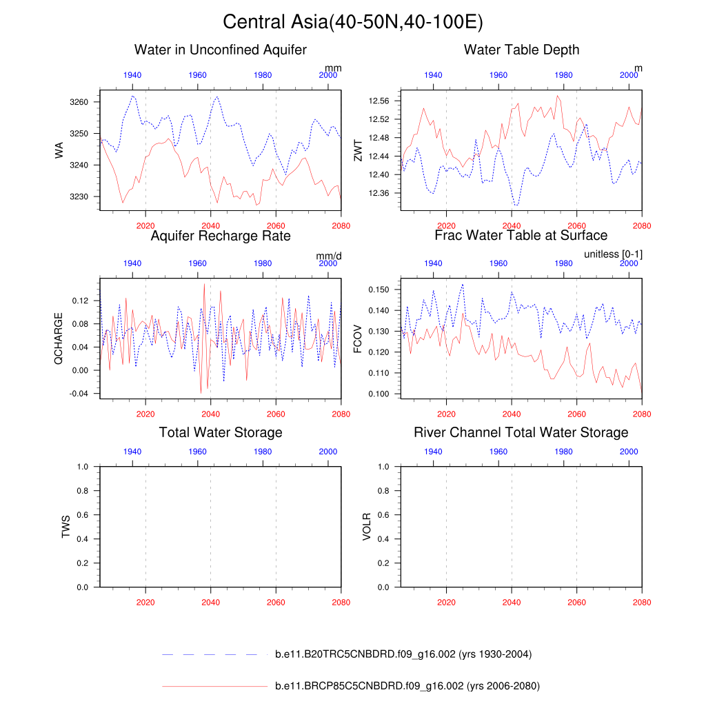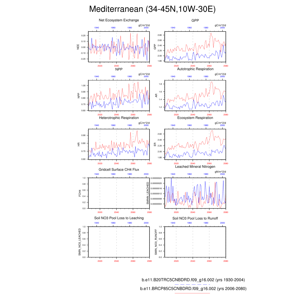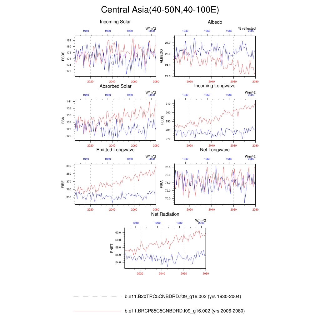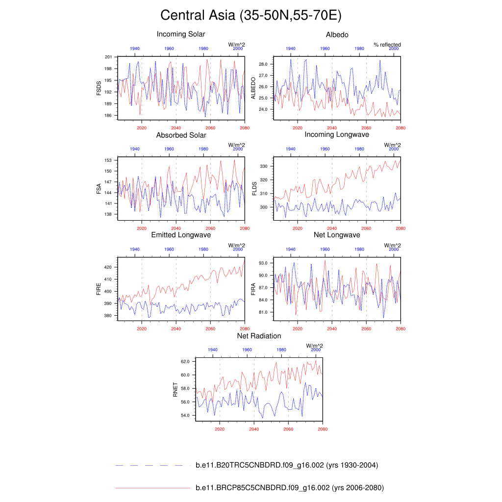 Set 6 Description: Line plots of annual trends in regional soil water/ice and temperature, runoff, snow water/ice, photosynthesis