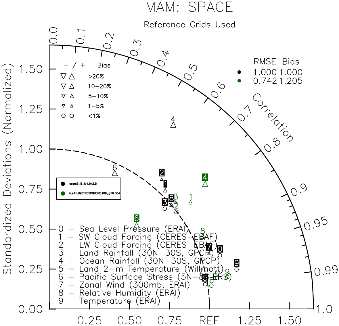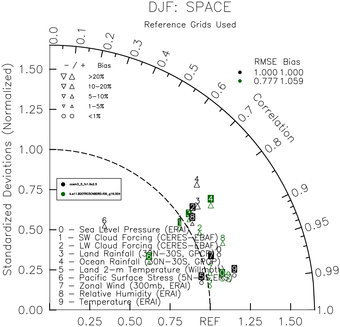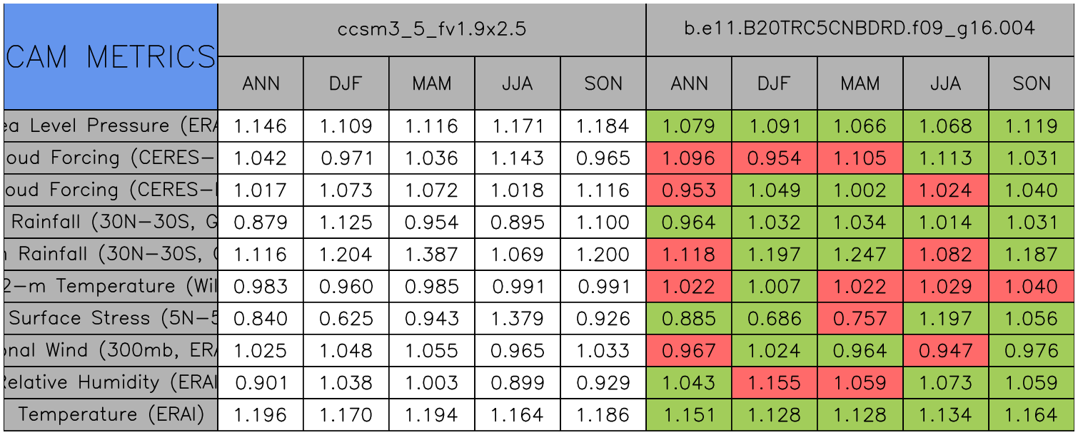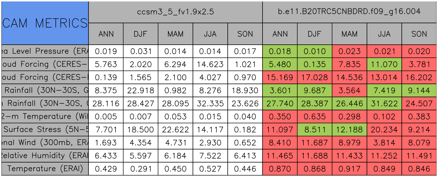 Taylor Diagrams were developed by Karl Taylor at PCMDI (paper|tech note) and aim to condense information about variance and RMSE characteristics of a particular model run when compared with observations in a single diagram. The tables summarize the individual metrics for each variable considered including: