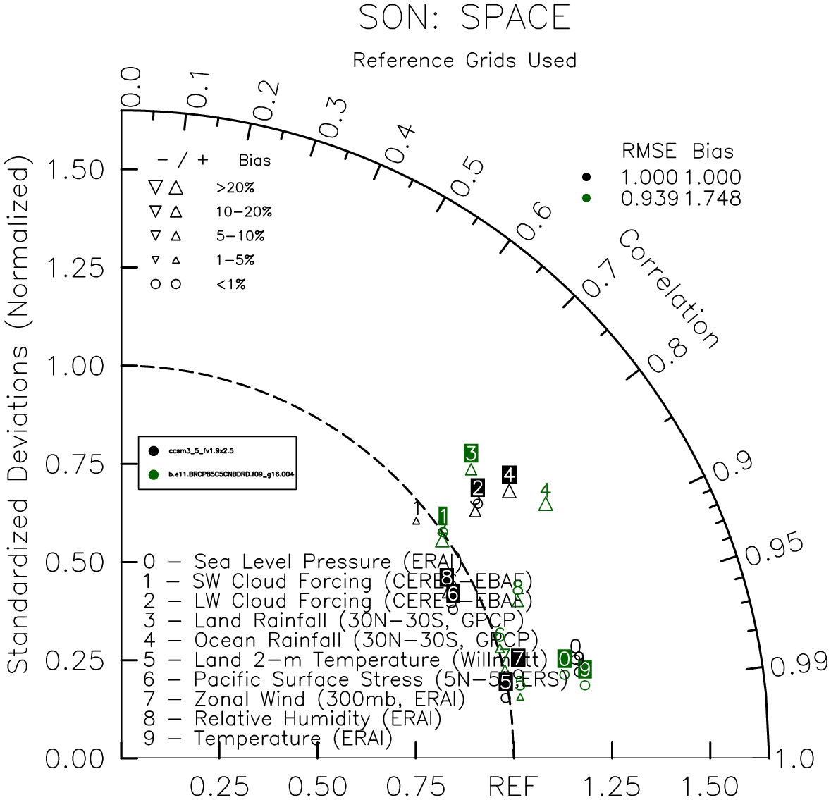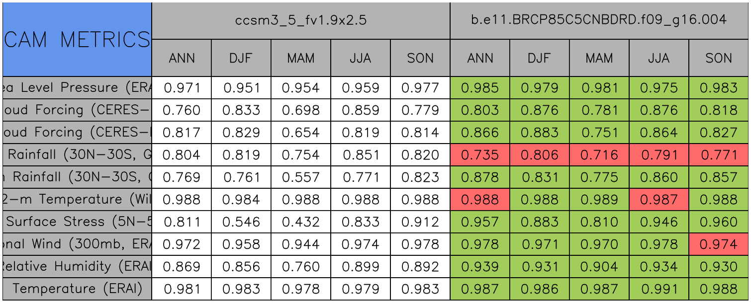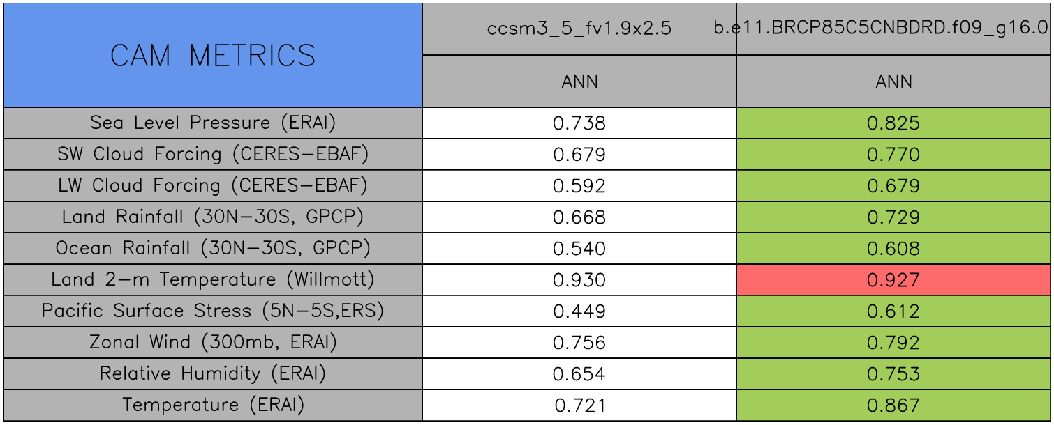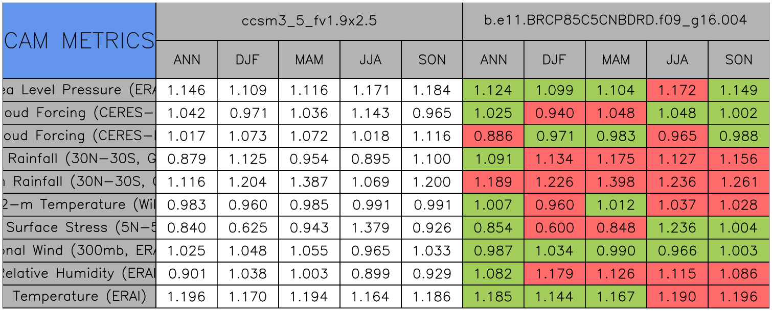 Taylor Diagrams were developed by Karl Taylor at PCMDI (paper|tech note) and aim to condense information about variance and RMSE characteristics of a particular model run when compared with observations in a single diagram. The tables summarize the individual metrics for each variable considered including: